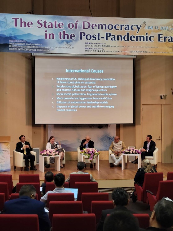 A week-long series of meetings and a public conference were held in Taipei, June 11–15, 2023 — the first major in-person gathering of the Global Barometer Surveys and Asian Barometer Survey networks since the COVID-19 pandemic. On June 11–12, a GBS working meeting brought together the principal directors of the five regional barometer projects — Afrobarometer, Arab Barometer, Asian Barometer, Eurasia Barometer, and Latinobarómetro — to discuss leadership transitions, budget matters, GBS governance, and the development of new core modules for the next survey wave (including questions on social media, populism, and authoritarianism). On June 13, a public international conference, "The State of Democracy in the Post-Pandemic Era," was held at National Taiwan University's Liang Guo-shu International Conference Hall. Professor Larry Diamond (Stanford University) delivered a keynote address titled "Is the World Still in a Democratic Recession?" followed by a roundtable with Professor Andrew J. Nathan (Columbia University) and regional barometer leaders. On June 14–15, the Asian Barometer Survey convened its planning meeting, reuniting all 16 country team coordinators for the first time in three years to review Wave 6 results, discuss methodological innovations, and plan for Wave 7.